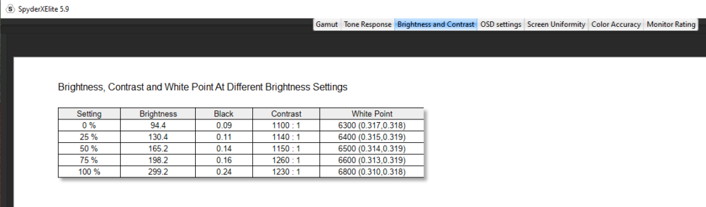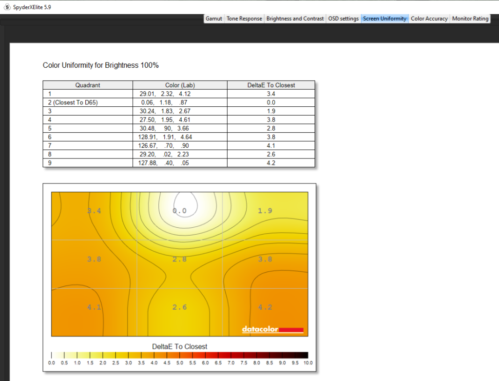 Running tests on the monitor, I found that my panel here was capable of 100% sRGB, 86% AdobeRGB and 95% P3 colour gamuts and to be fair to AOC with their contrast ratio claims, I found that 100% brightness or around 299 nits, it gave me a 1230:1 contrast ratio while 50% brightness or 165 nits had me closer to 1150:1 contrast ratio. Where I did find the monitor fell down a bit was with its colour uniformity, and at 100% brightness in the bottom left and bottom centre had issues with hot and cold spots, while the luminance uniformity, it was a bit sporadic over the entire panel, with the bottom left and left-hand side waving further from the path. Pre-calibration the colour accuracy wasn’t really too bad which I was shocked at, with an average Delta-E of 2.00, with the greys really falling down here, and post-calibration with my Datacolor Spyder Elite, the average Delta-E sat at 2.7. So out of the box, not really a bad monitor to be honest.