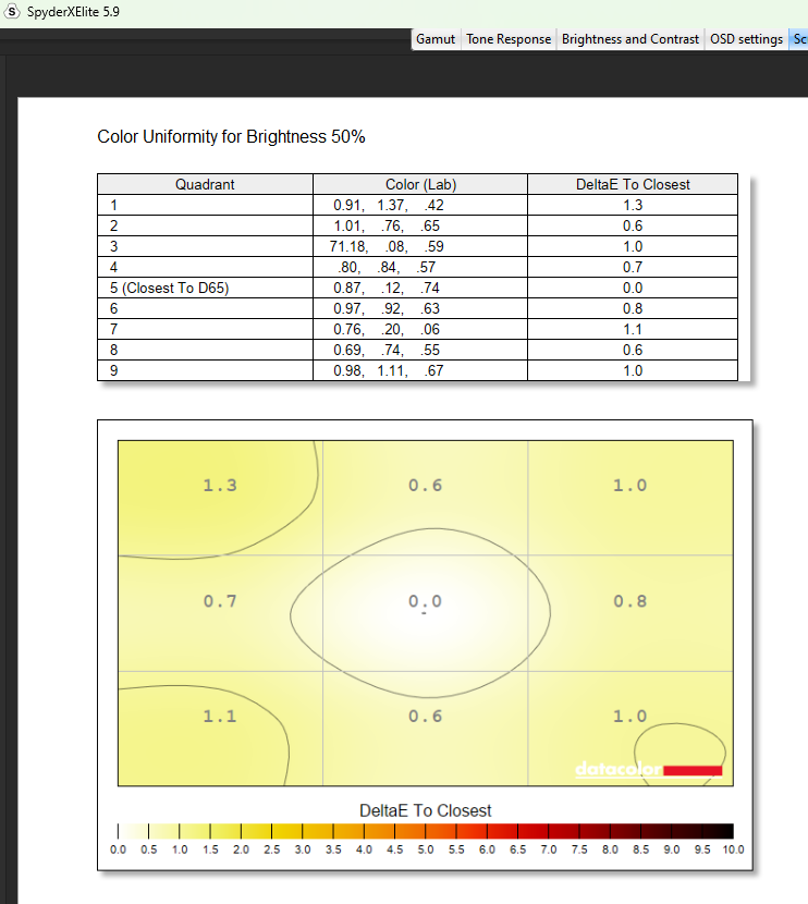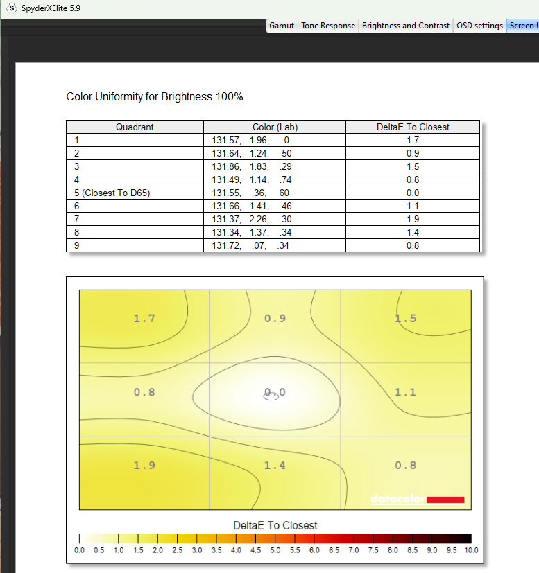With the colour uniformity of this particular panel though, there was a slight issue with the centre at 50% brightness, and when I say slight I mean extremely slight, with a hotspot appearing though at 100% brightness, the results were pretty much on par, with the centre being unaffected with the increase in brightness, but the edges getting slightly inaccurate, but again, by no means is this really an issue. And then the same with luminance uniformity performing superbly with a slight offset of 3% towards the bottom right-hand corners at 50% brightness. at 100% brightness it was all good.