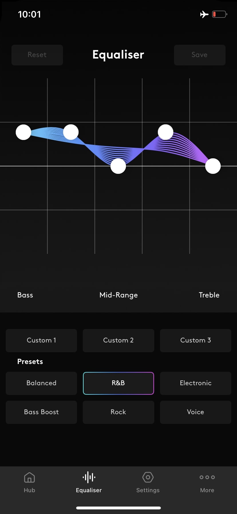 The app includes an equalizer for the earbuds and it’s great. There are six presets and three custom profiles, which you can edit and save. Clicking between the six presets, the profile change is instant in the earbuds, allowing you to very quickly understand which preset is best for which song. Above the presets are five white dots, which symbolise the EQ options between bass, mid and treble. Slide them up and down to build your own sound profile and save it out. Again, sliding up and down, the change is instant in the earbuds, no need to save and wait for them to transfer or update. It’s all very efficient and I love it.