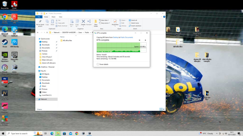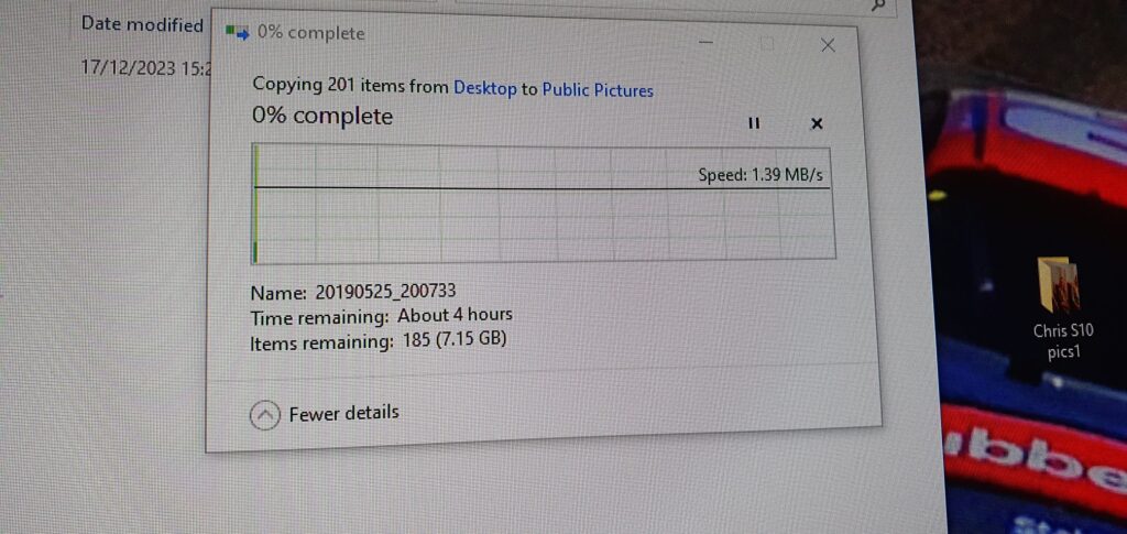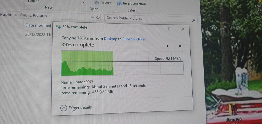 A laptop was left in the lounge. Then we transferred the entire 693 files of an older version of Microsoft Office between the two over a home network. For the majority of the transfer, it hovered around 350KB/s, remember the distance and chunky walls, but did spike a few times to around four times that. Even saw 2MB/s a couple of times. Windows guessed it would take just under the hour and the phone stopwatch halted at 52 minutes 35 seconds.