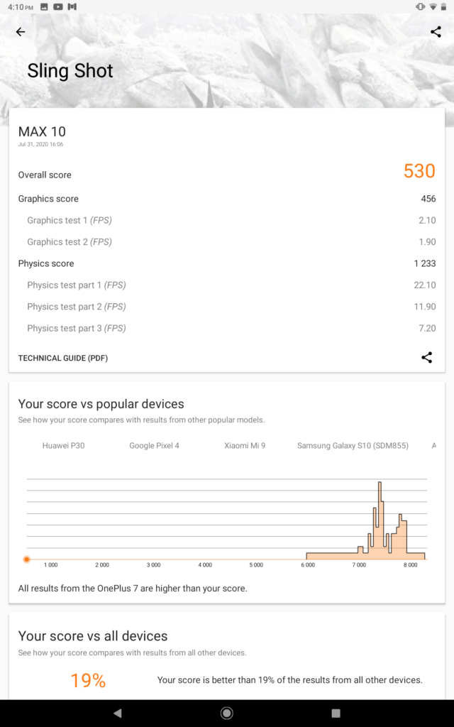 On Geekbench 5.2, we achieved a score of 150 on single-core, 768 on multi-core, which is comparable to something like the Samsung Galaxy Tab Pro 8.4 @ single-core, which is really old tech now. For reference, the new OnePlus8 achieves a single-core score of 904! We also tried the Max 10 with the Sling Shot benchmark by 3D Mark and it achieved an overall score of 530. Watching it benchmark was quite painful, the FPS was in single figures and it didn’t handle it very well at all. For reference, the iPhone 11 achieved something in the region of 7000 points.
