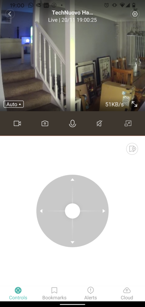 Once on the homescreen of the partner app, it’s all very straight forward. There’s a big touch controlled joystick that enables you to angle the camera how you like it. Great news, this camera has an almost 180-degree pan view, and can even tilt up and down too. There’s a button to start recording, and there’s also audio passthrough too, so if you’re not in your home, you can talk to whoever’s in your home.