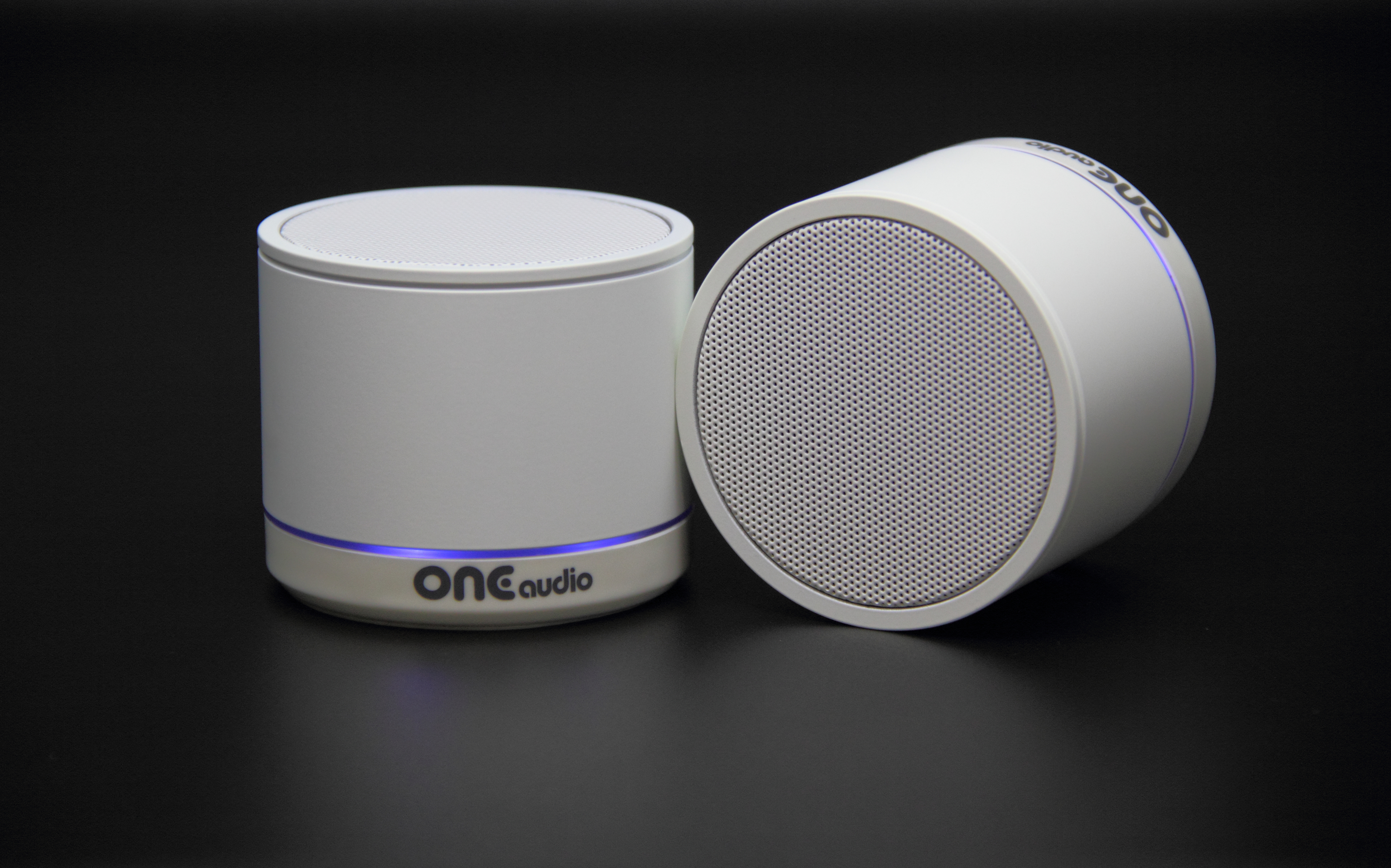 ONEAudio has done a fantastic job of making these speakers as small as possible while still retaining a decent sound quality. This is down to the materials used and the actual style of speakers they’ve opted for. Both left and right audio units are cylindrical, with the speakers in the top. This creates a more audio room filling experience rather than music being fired directly at you. The speakers are an off white creamy colour with the ONEMicro logo on the front. The bottom of the speaker is covered in  a rubbery surface giving them grip on a counter. Oh and another thing, they are pretty heavy for their size.