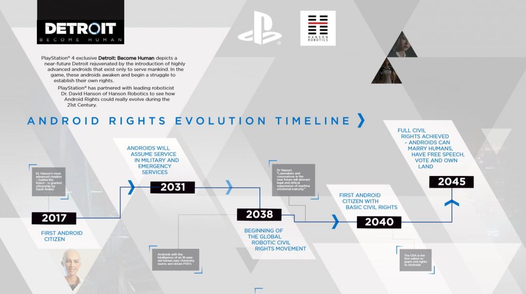 The paper has been commissioned alongside the release of the new PS4 sci-fi title Detroit: Become Human. Dr. David Hanson comments: “As depicted in Detroit: Become Human, lawmakers and corporations in the near future will attempt legal and ethical suppression of machine emotional maturity, so that people can feel safe.”
