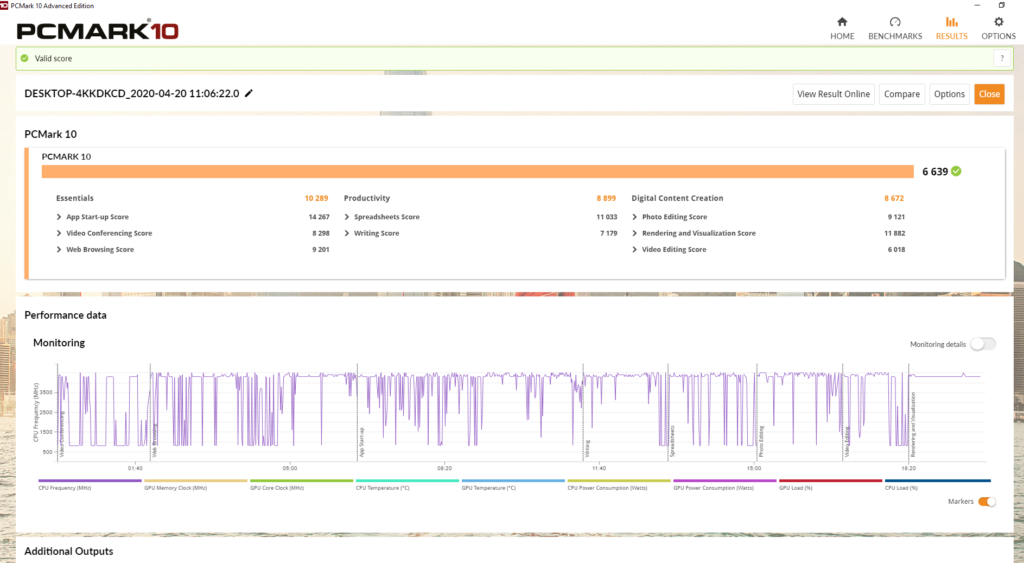 Prime95, with an outside temp of 12C on the PC under a desk in a warm room, started at 30C and peaked at 73C after a 10 minute run with the standard default mixed test. PCMark 10 returned an overall score of 6639. In 3DMark, we were recommended to run the Time Spy benchmark and we were left with a score of 6301.