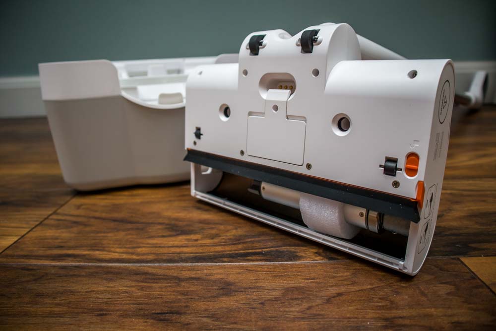 In the box you get the cleaner itself, in three sections, the charging & cleaning base, associated accessories, and some instructions. First impressions are very good. It’s an all-white affair, with subtle hints of an orange/rose gold chrome and a splash of grey. It’s lightweight, sturdy and feels well manufactured. From top to bottom, the handle has two buttons, power, and self-clean. Moving down you have a brushed metal shaft, leading to the mop head itself. There are two indicator lights, showing power level and roller replacement requirements. The head itself resembles your traditional vacuum cleaner. It has a clear front cover, which can be opened to showcase the brush and sponge. Keep going further down and the cleaner sits on an all in one charging and self-cleaning station. Sit it on top, it’ll somewhat clip in and begin to charge when contact between the base and cleaners metal prongs are touching. The base also acts as it’s cleaning station, so once you feel the cleaner is dirty enough, pop it on and let it clean itself.