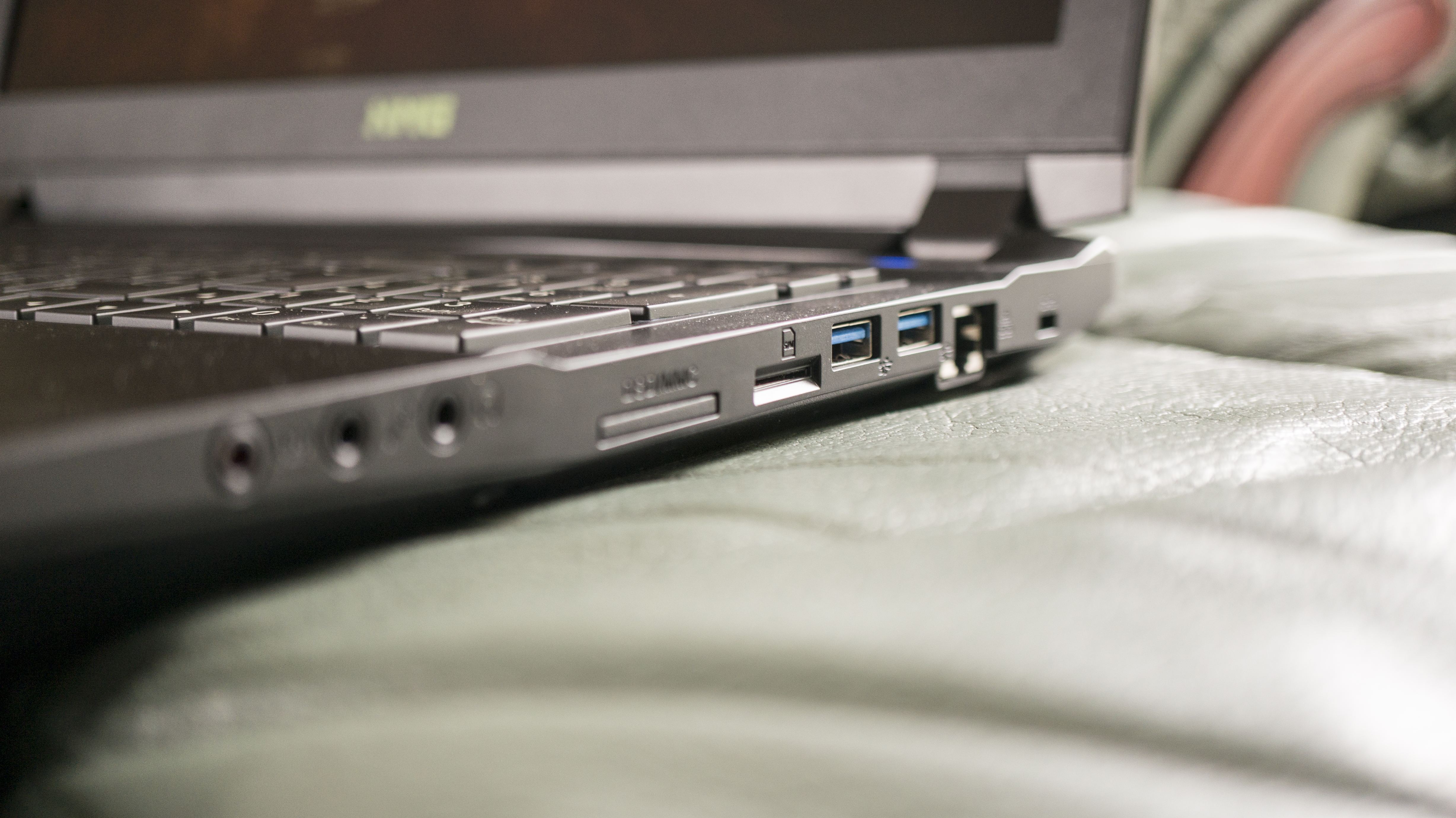 Looking around the outside of the laptop you will find the power and SATA connections on the rear, three USB 3.0 inputs, a headphone and microphone jack, an SD card reader and generously three display ports down one side for multiple monitor setups. Everything is conveniently placed down the sides of the laptop freeing up the front keeping it quite skinny. There are large fan exhausts on the left side and back for decent airflow around the powerful components. The chassy has a matte black finish which can be prone to greasy finger marks, but with a quick wipe down, the case looked good as new. There is a black logo print on the top which I was expecting to light up in that gamer fashion but it doesn’t. Keeping it as black gloss gives it some style. The dimensions when closed comes in at 385x271x29mm and weighs 2.5g which I didn’t think was too bad, but it could be a problem if carrying it around for long periods of time.